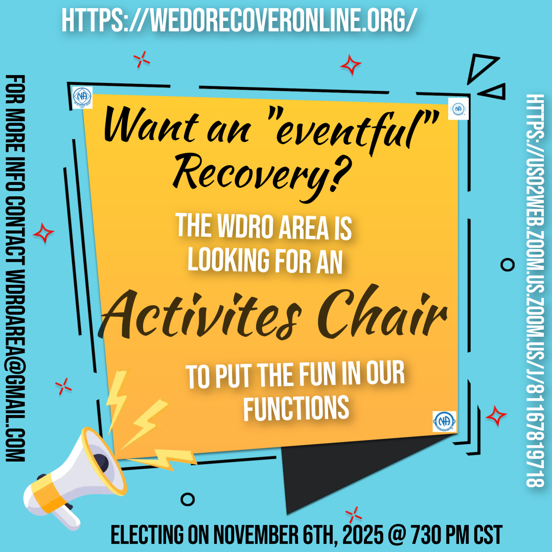 The WDRO Area is seeking members who are interested in Chairing the WDRO Area Recs & Acts Subcommittee. There is a clean time requirement for this position so please read our Area policy packet for duties and responsibilities.